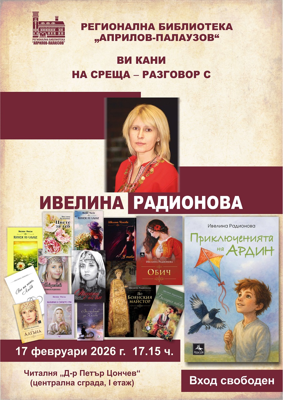 Поетесата от Провадия Ивелина Радионова ще запознае габровци с творчеството си във вторник – 17 февруари 2026 г., от 17:15 часа в читалнята „Д-р Петър Цончев“. Новината съобщават от Регионална библиотека „Априлов – Палаузов“, която ще е домакин на срещата.