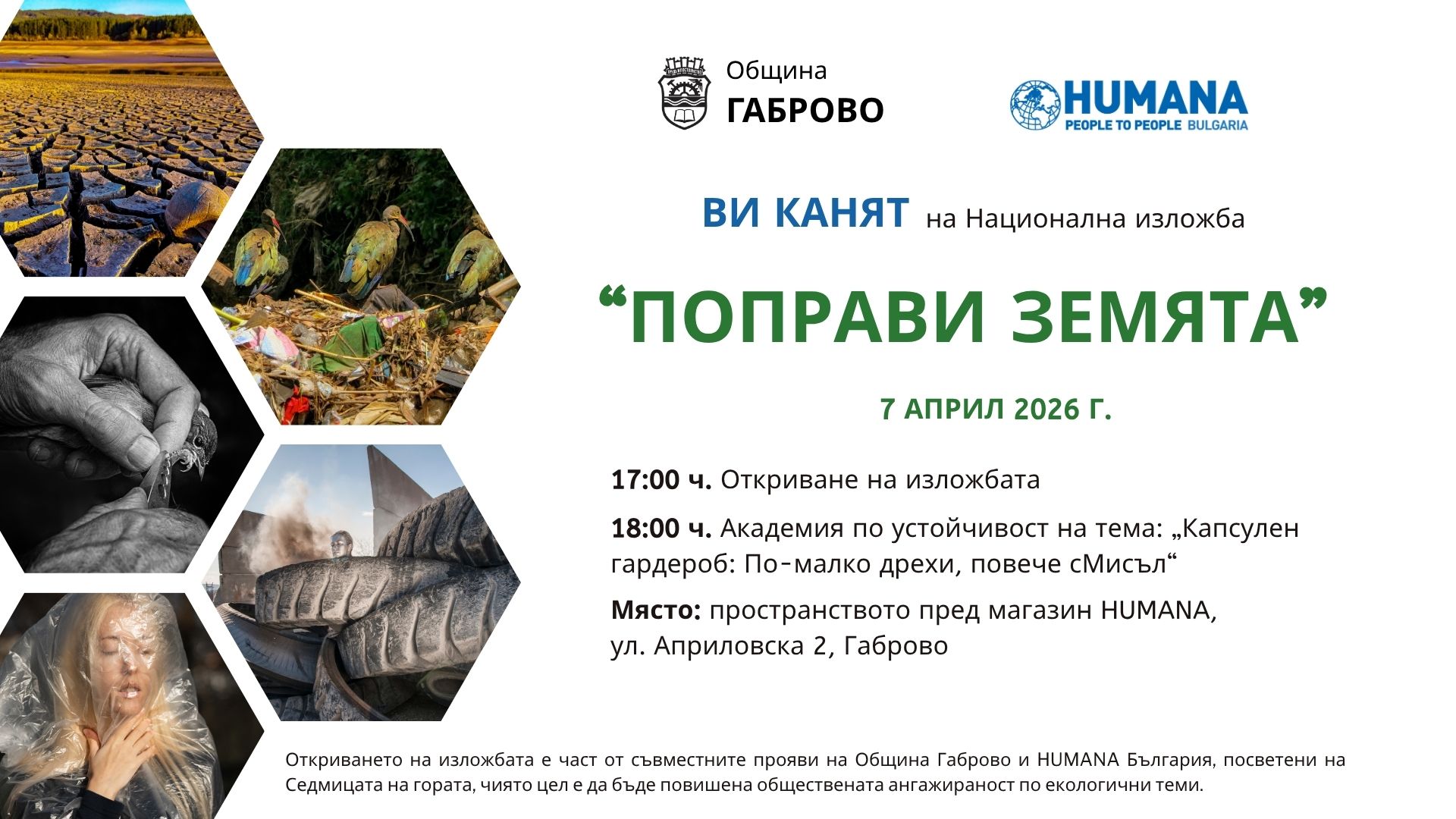 „След успешното участие в конкурса на над 200 професионални фотографи и любители с отношение към проблемите на околната среда, направихме селекция на 30 творби с послание, които да бъдат представени на национални изложби. Те разглеждат актуални теми като замърсяване, последици от климатичните промени, пожари, грижа за животинския свят.“ – споделят организаторите на конкурса HUMANA People to People България и Школата за деца в неравностойно положение „Дедал“ – Варна.