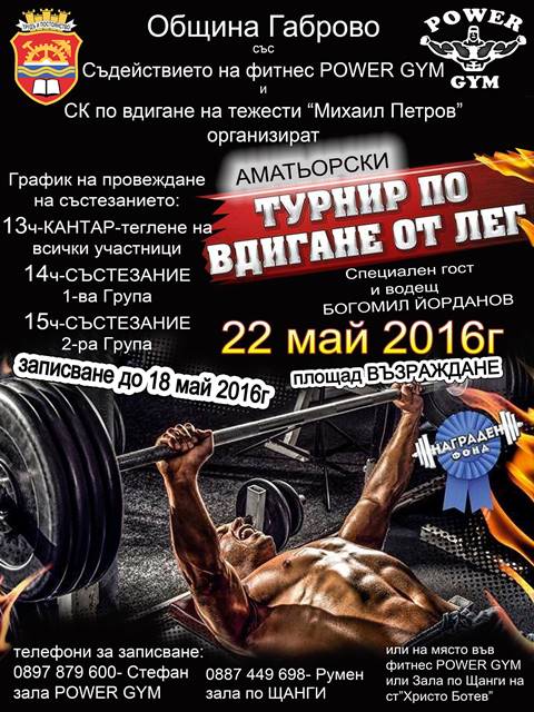 Аматьорски турнир по вдигане от лег ще има на пл. „Възраждане“. Организатори са Община Габрово със съдействието на фитнес център Power Gym и спортен клуб по вдигане на тежести „Михаил Петров“. Състезанието ще се проведе по следния график: от 13.00 часа – кантар – теглене на всички участници; от 14.00 часа – състезание І група и от 15.00 часа – състезание ІІ група.