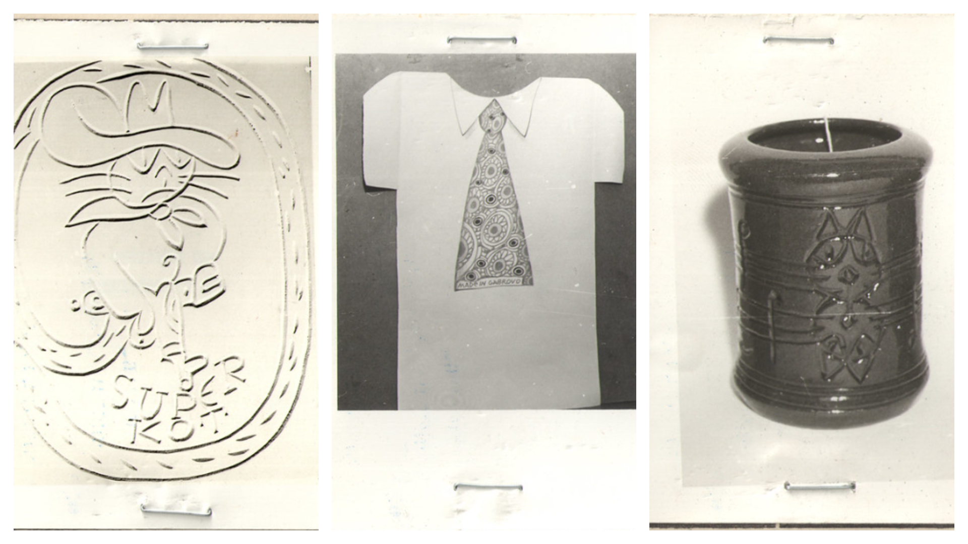 На снимките от ляво надясно: гипсов релеф „Super кот“, тениска с вратовръзка и надпис „Made in Gabrovo“, ваза с релефна украса „котка“ © МДХС