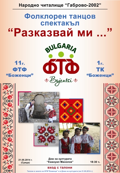 На танцова фиеста под надслов „Разказвай ми …“ Ви канят Фолклорна танцова формация „Боженци” при народно читалище „Габрово-2002” и училище „Св. св. Кирил и Методий”.