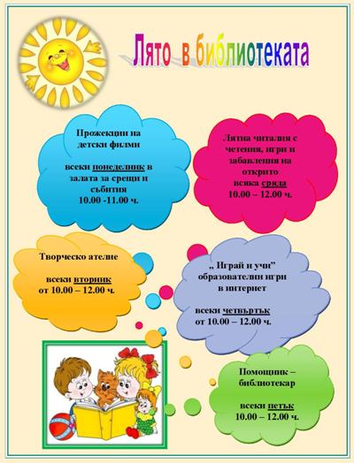 Вече отвори врати лятната читалня, в която всяка сряда от 10.00 до 12.00 часа в беседката в градинката зад библиотеката децата могат да четат и слушат любими приказки, гатанки и стихчета, да оцветяват приказни герои, да подреждат пъзели и кубчета, да играят образователни игри, да рисуват, да гледат драматизация на известна приказка и да се забавляват с помощта на библиотекарите. Необикновената читалня ще работи до края на месец август.
